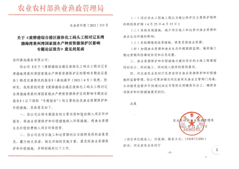 近日,《黃驊港綜合港區液體化工碼頭工程對遼東灣渤海灣萊州灣國家級水產種質資源保護區影響專題論證報告》取得了農業農村部的批復。農業農村部批復的取得加快了液體化工碼頭工程項目前期手續跑辦的進度,為項目開工建設奠定了堅實基礎。