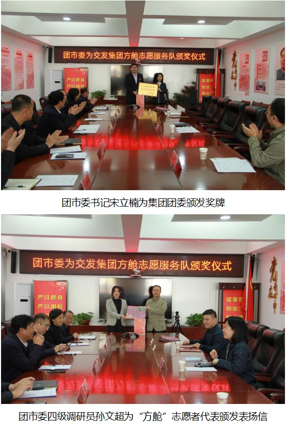 交發(fā)集團黨委委員、副總經(jīng)理李文靜主持會議,交發(fā)集團黨委副書記王澎簡要匯報了交發(fā)集團志愿服務活動開展情況;團市委孫文超調(diào)研員宣讀了感謝信;團市委宋立楠書記為交發(fā)集團頒發(fā)了獎牌,并對交發(fā)集團高度的社會責任感和廣大干部職工勇于擔當、敢于奉獻的精神給予肯定和贊揚。交發(fā)集團黨委書記、董事長劉俊德、黨委副書記、副總經(jīng)理楊正宇以及集團相關部室領導和志愿者代表參加會議。