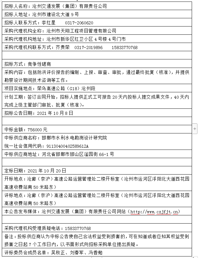 榮烏高速公路(G18)滄州段改擴建工程防洪評價編制單位采購中標公告