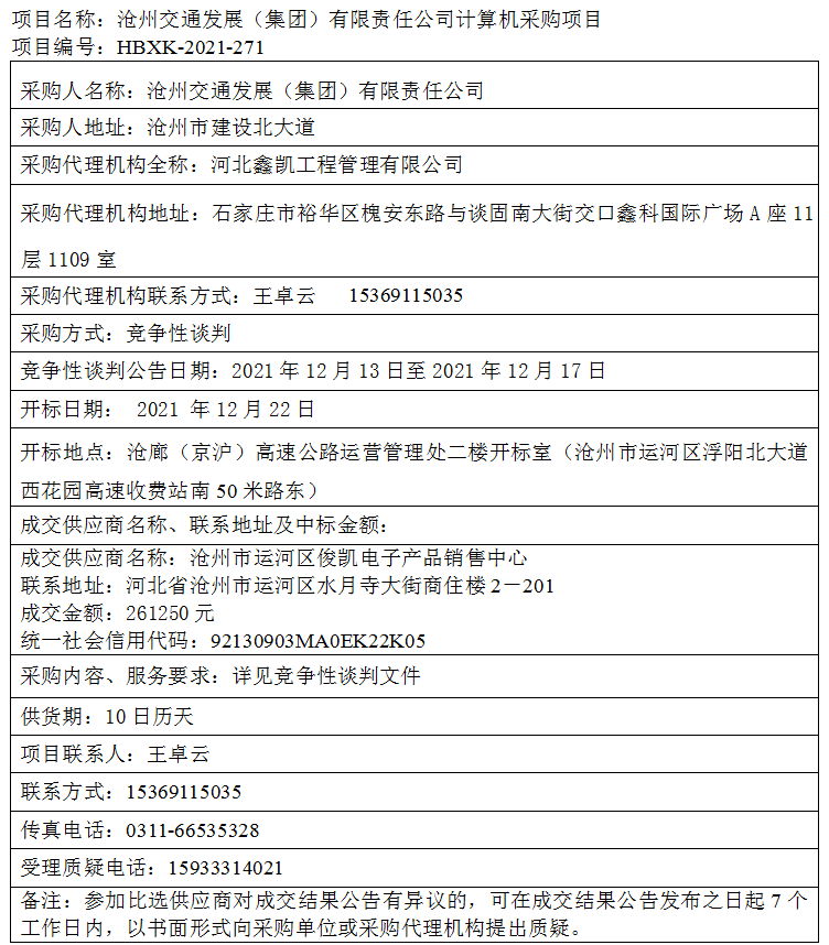 滄州交通發展(集團)有限責任公司計算機采購項目 成交結果公告