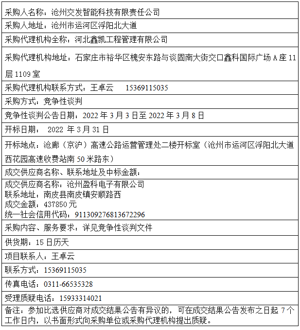 滄州高速公路稽查稽核系統設備采購安裝項目 成交結果公告