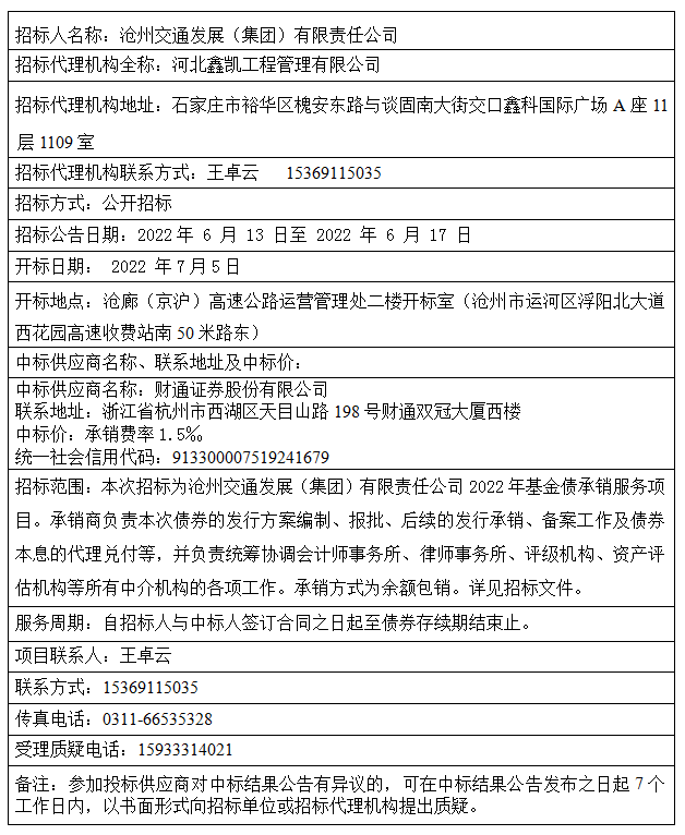 滄州交通發展(集團)有限責任公司2022年基金債承銷服務項目 中標結果公告