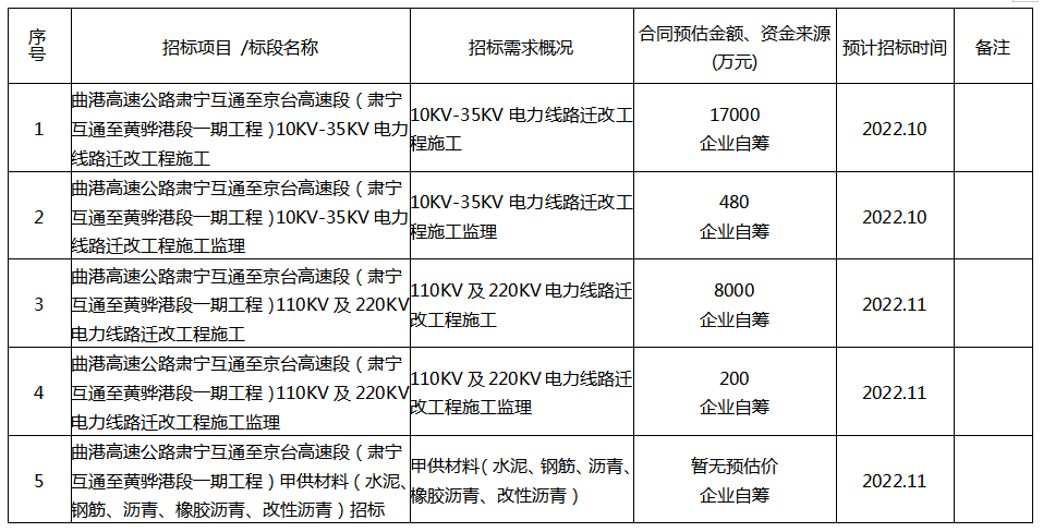 為便于投標人及時了解招標投標信息,根據《關于推動國有企業招標人落實提升招標投標活動質量若干措施工作的通知》 (滄審批字(2021)19號)等有關規定,現將滄州曲港高速公路建設有限責任公司 2022年新增項目招標計劃公開如下: